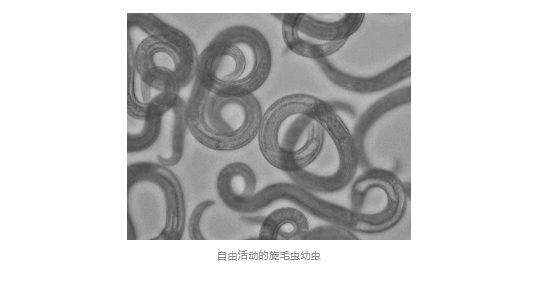 成蟲期:成蟲會在人體的小腸中停留幾周甚至幾個月來“產(chǎn)子”(卵胎生)。產(chǎn)出的幼蟲“寶寶”穿透腸壁,隨著血液和淋巴系統(tǒng)擴散到全身肌肉中,形成“囊包”。