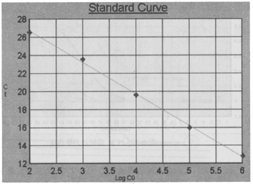 ABI公司首先根據(jù)上述原理研制了ABI 7700 等系列定量PCR儀,在PCR反應(yīng)中設(shè)置標(biāo)準(zhǔn)模板系列(一般5~7個(gè)標(biāo)準(zhǔn)濃度)反應(yīng)管和空白對(duì)照管。通過(guò)實(shí)時(shí)檢測(cè)反應(yīng)管中的熒光信號(hào),計(jì)算出RQ+、RQ-、△RQ。RQ+代表樣品管熒光報(bào)告基團(tuán)發(fā)光強(qiáng)度與淬滅基團(tuán)發(fā)光強(qiáng)度的比率,RQ-代表空白管中二者的比率,△RQ(△RQ = RQ+-RQ-)代表PCR過(guò)程中熒光信號(hào)變化量。當(dāng)熒光信號(hào)增強(qiáng)到某一閾值(根據(jù)熒光信號(hào)基線的平均值和標(biāo)準(zhǔn)差,計(jì)算出以99.7%的置信度大于平均值作為閾值)時(shí),標(biāo)準(zhǔn)模板反應(yīng)管所用的循環(huán)次數(shù)(Ct值)就被記錄下來(lái)。Ct值與標(biāo)準(zhǔn)模板數(shù)量的對(duì)數(shù)值之間有嚴(yán)格的線性關(guān)系[3],利用系列標(biāo)準(zhǔn)模板的Ct值,制成標(biāo)準(zhǔn)曲線(圖3),根據(jù)待測(cè)樣品的Ct值,就可在標(biāo)準(zhǔn)曲線中確定待測(cè)樣品起始的DNA數(shù)量。根據(jù)數(shù)據(jù)處理,即可得出定量結(jié)果。探針設(shè)計(jì)一般應(yīng)符合以下條件[2]:①探針長(zhǎng)度應(yīng)在20~40個(gè)堿基左右,以保證結(jié)合的特異性。②GC堿基含量在40%~60%,避免單核苷酸序列的重復(fù)。③避免與引物發(fā)生雜交或重疊。④探針與模板結(jié)合的穩(wěn)定程度要大于引物與模板結(jié)合的穩(wěn)定程度,因此探針的Tm值要比引物的Tm值至少高出5℃。另外,探針的濃度,探針與模板序列的同源性,探針與引物的距離都對(duì)實(shí)驗(yàn)結(jié)果有影響。