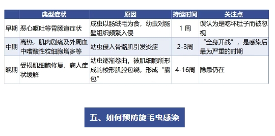 成蟲期:成蟲會(huì)在人體的小腸中停留幾周甚至幾個(gè)月來(lái)“產(chǎn)子”(卵胎生)。產(chǎn)出的幼蟲“寶寶”穿透腸壁,隨著血液和淋巴系統(tǒng)擴(kuò)散到全身肌肉中,形成“囊包”。