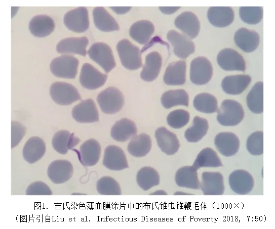 2017年8月,中國疾病預(yù)防控制中心寄生蟲病預(yù)防控制所(國家熱帶病研究中心)接報了一例從非洲旅游歸國的不明原因發(fā)熱病例,該患者就診于福建醫(yī)科大學(xué)附屬協(xié)和醫(yī)院,福建省疾病預(yù)防控制中心病原學(xué)檢測初步判斷為錐蟲病,中國疾病預(yù)防控制中心寄生蟲病預(yù)防控制所復(fù)核確認(rèn)為我國首例羅得西亞非洲錐蟲病并開展聯(lián)合處置工作。該患者于7月23日至8月5日在非洲肯尼亞和坦桑尼亞旅游,7月28日在坦桑尼亞的賽倫蓋蒂國家公園大草原中有被“牛蒼蠅” 叮咬史,8月6日回國后發(fā)現(xiàn)右腳后跟(叮咬部位)有一暗紅色包塊,中央有破潰,周圍略腫脹,有壓痛,質(zhì)地較軟,8月8日起持續(xù)性高熱。根據(jù)流行病學(xué)史、臨床表現(xiàn)以及實驗室檢查等結(jié)果8月14日被確診為布氏錐蟲羅得西亞亞種感染引起的非洲錐蟲?。ㄈ鐖D1)。