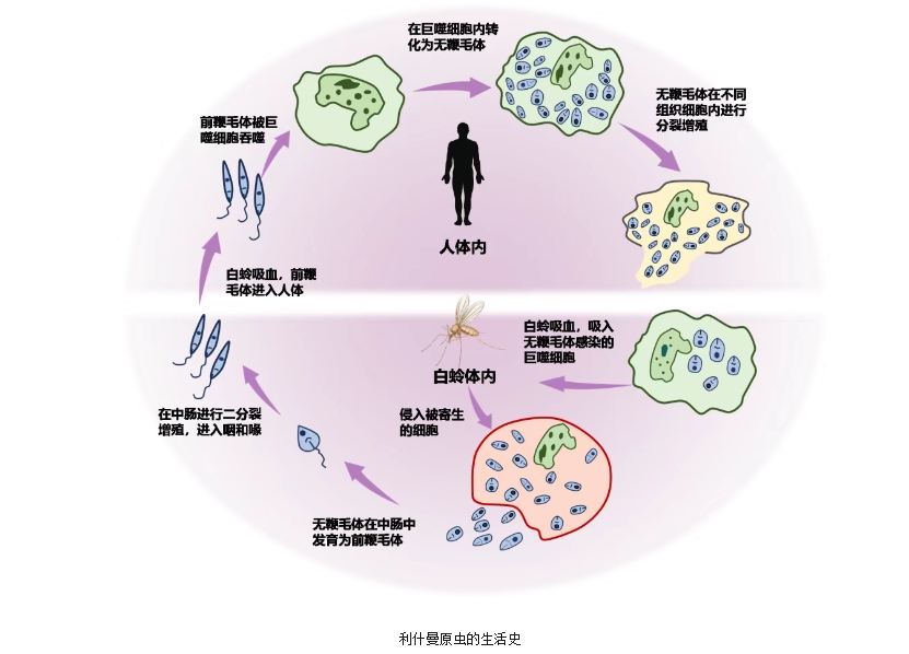 傳播過(guò)程?:白蛉通過(guò)叮刺病人或受感染的動(dòng)物宿主時(shí),含無(wú)鞭毛體的巨噬細(xì)胞被白蛉吸入并在體內(nèi)發(fā)育成具有感染力的前鞭毛體,轉(zhuǎn)而叮刺健康人,前鞭毛體即隨白蛉唾液進(jìn)入人體,從而引起感染?。